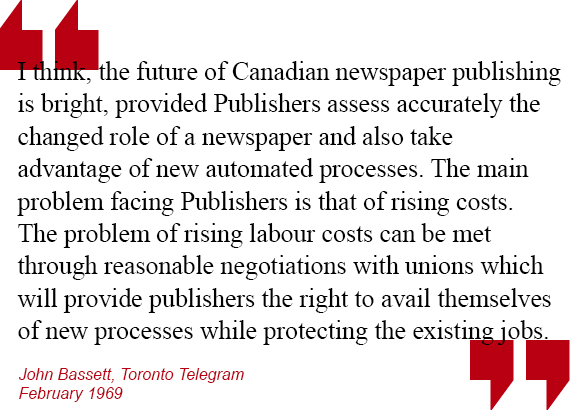 The Toronto Typographical Union (TTU) found itself in labour negotiations with all three publishers in 1963. Known as TTU #91, the union had until that time enjoyed relative harmony with the publishers. The oldest Union in Canada, the TTU had taken a stand back in 1872 when they struck George Brown’s Globe demanding a 9-hour day. Some suggest it was this catalyst that gave us Labour Day in September.